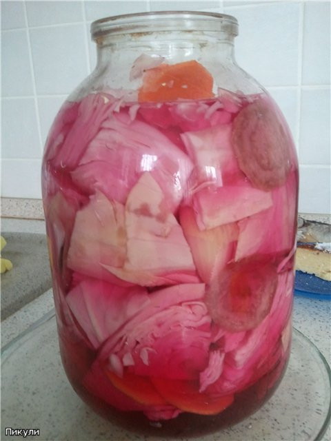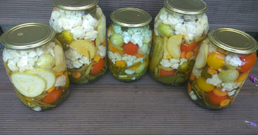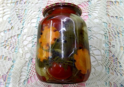 В принципе, попробовав этот рецепт, оказывается, что удобнее закрывать ассорти из солений в больших банках (1,5 и 2 литра). В них удобнее размещать слои овощей. Это будет более вкусным и зрелищным. Для стерилизации и нагревания двухлитровых банок рекомендуется увеличить время стерилизации на 15 минут, а полуторалитровых — на 10 минут.