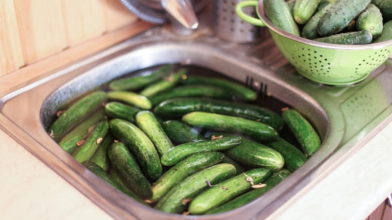 - Вымойте огурцы в холодной воде и ототрите грязь. Не используйте нож — это разрушит кожу овощей, что недопустимо.