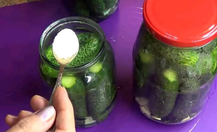 - Добавьте лимонную кислоту перед заливкой рассолом в каждую банку. А затем налейте кипящую воду. Мы не тратим время впустую и сразу закатываем банки.