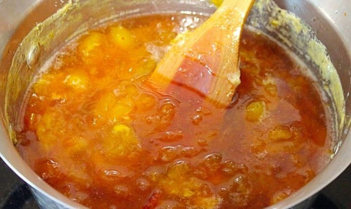 После того, как основной продукт выделит сок, емкость с ломтиками персика отправляют на огонь. Варят в течение 10 минут, а затем половником удаляют часть выделенного сока. Мякоть варят достаточно долго, пока сироп, в котором она готовится, не станет вязким.