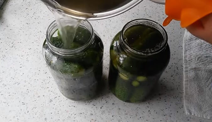- Залейте огурцы маринадом и стерилизуйте емкости в кипящей воде до изменения цвета овощей примерно 5 минут.