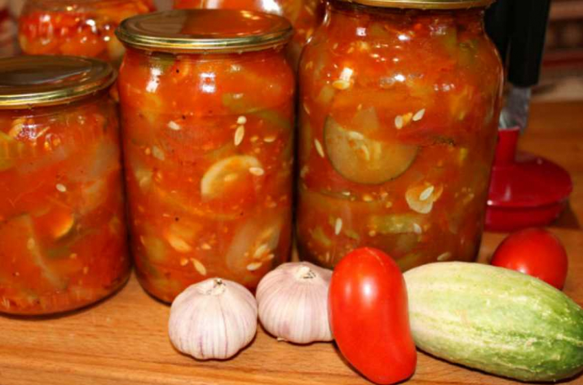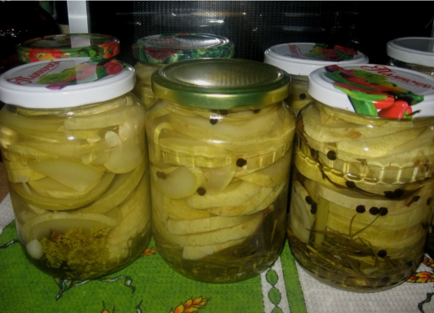 Пропорции продуктов соответствуют 4 банкам по 1 л каждая:- Огурцы/кабачки — 3 кг;