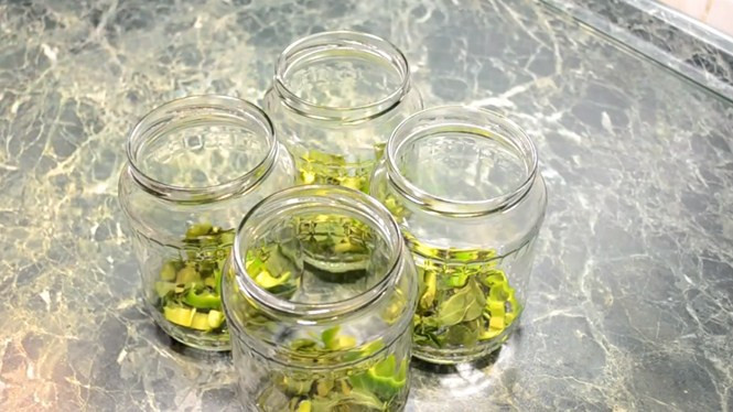 - На дно банок положите все листья и всыпьте 1,5 ч. л. горчицы.