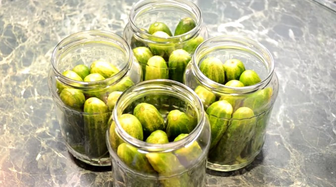 - Заполните банки огурцами. Старайтесь укладывать максимально плотно, но не повреждая плоды.
