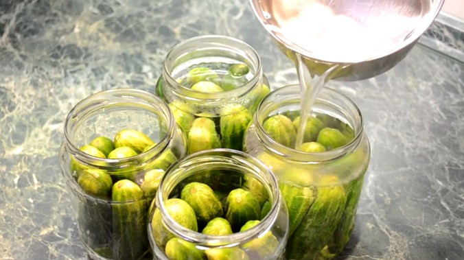 - Огурцы с чесноком, перцем и укропом укладывают в банки, заливают кипятком и оставляют на 30 минут.
