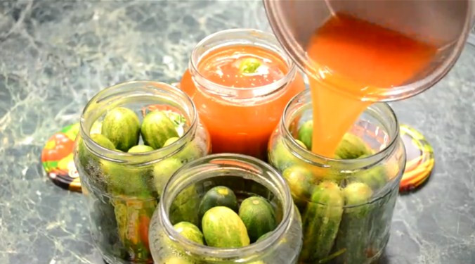 Для томатной заливки в кастрюле смешать ингредиенты до полного растворения составляющих. Довести рассол до кипения. Залить кипящую жидкость в банки с огурцами до самого верха.