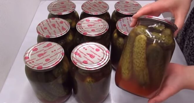 - Затем очень аккуратно вынимаем из кипятка и закатываем на хранение. Обязательно смотрим на способность крышки удерживать рассол и убираем баночку остывать в перевернутом виде.