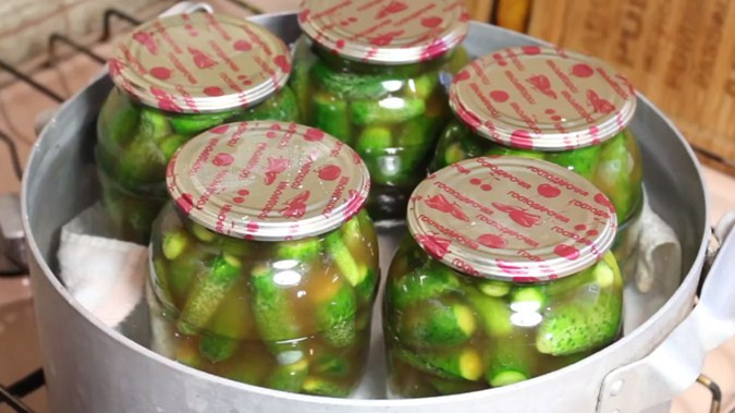 - После этого огурцы необходимо промариновать. Для этого требуется взять емкость больших размеров и поставить в нее все банки с огурчиками. Налить теплую воды в кастрюлю и поставить на плиту. Стерилизация должна проходить в течение 10 минут на маленьком огне. Затем переворачиваем, укутываем, и оставляем до полного остывания.