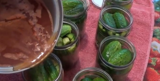 - Ставим на огонь, и кипятим 1-2 минуты, не забываем помешивать, чтобы сыпучие ингредиенты растворились. Банки наполняем огурцами, складываем их плотно. И заливаем маринадом. Чтобы было удобно наливать, возьмите лейку, так вы наполните банку, а не прольете маринад.