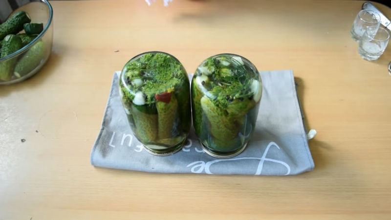 - Укладываем огурцы в банку, кипятим воду и заливаем в банку.