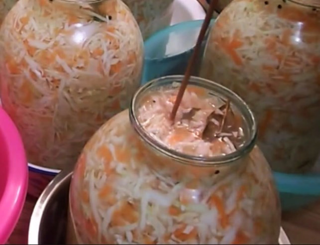- Уже на следующий день появятся признаки брожения. Чтобы не накапливался углекислый газ, ему помогают ему выйти с помощью деревянной палочки, которой протыкают капусту в течении следующего дня.