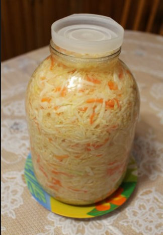 Капуста будет оседать. Прокалываем капусту, чтобы выпустить скопившийся в банке воздух, образующийся во время брожения. Для маринования довольно хорошие подходят поздние сорта капусты: в октябре они содержат высокий процент сахара. Процесс завершен. Ставим капусту в холодильник. Теперь можем добавить готовую капусту в винегрет, а также использовать как самостоятельную закуску.