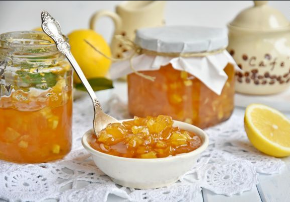 При приготовлении варенья используются все части фруктов: мякоть и кожура. Варенье из Кабачков, яблочнок и лимонного варенья приобретает янтарный оттенок. Варить массу 45-50 минут. После готовая масса выливается в банки.Когда варенье разливается по емкостям, кастрюля не снимается с огня. Варенье выливается кипящее.