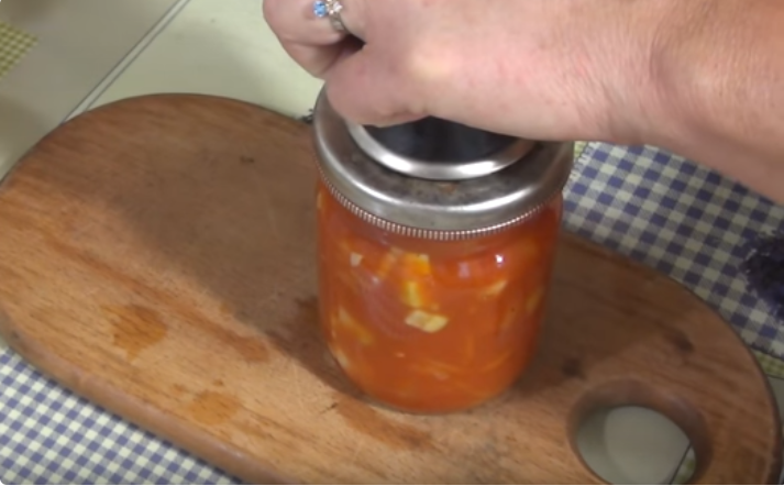 - А пока мы стерилизуем банки и крышки. Мы помещаем готовое лечо в простерилизованные банки и закрываем горячей крышкой. Закатываем ключом и ставим банки на крышки, позволяем им остыть. Лечо остыло, осталось протереть банки и положить их в шкаф.