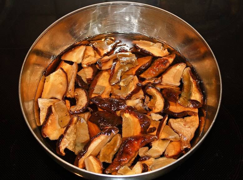 - Замочите сушеные грибы в холодной воде на 3 часа, затем варите в этой же воде 30 минут, посолите.