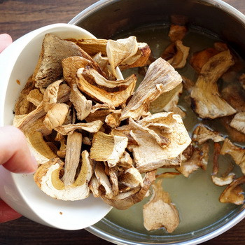 Чтобы замочить грибы, используйте чистую воду комнатной температуры. Чтобы ускорить процесс набухания, вы можете немного её подогреть.Ни в коем случае нельзя заливать сухие продукты кипящей водой. Тогда вы получите ароматную воду, и грибы станут безвкусными и жесткими.Если нужно быстро добавить ингредиент в блюдо, будет более правильным измельчить сухую заготовку и использовать ее в качестве приправы.