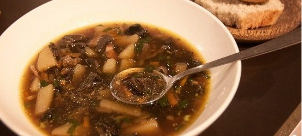 - Подается суп из вареных сушеных грибов с рубленой зеленью, свежим белым хлебом и густой сметаной.