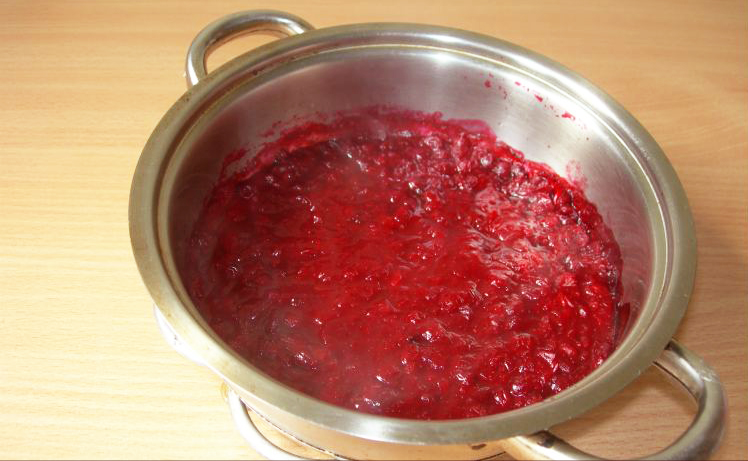 - Высыпьте ягоды в кастрюлю, размешайте их и раздавите деревянной толкушкой или обычной столовой ложкой.