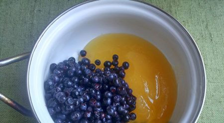 - Подготовленную чернику смешивают с сахаром, измельчают и помещают в огнеупорный контейнер.