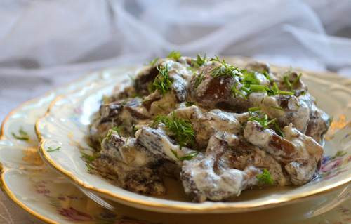 Через 15 минут открываем крышку, посыпаем содержимое сковородки мукой и перемешиваем. Затем смешиваем метану с водой и выливаем эту смесь на сковороду. Солим и перчим все, перемешиваем и тушим грибы еще 15 минут на медленном огне. Подаем опята с любым гарниром на ваше усмотрение.