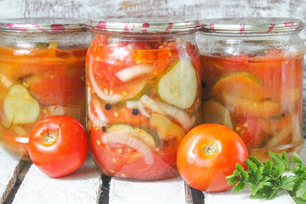 Пока готовится салат, можно использовать время для стерилизации банок и металлических крышек. Готовая заготовка расфасовывается в горячие банки и закатывается крышками. Раскладывая салат по банкам, проследите, чтобы в каждую были положены все виды овощей. После остывания консервация опускается в погреб.