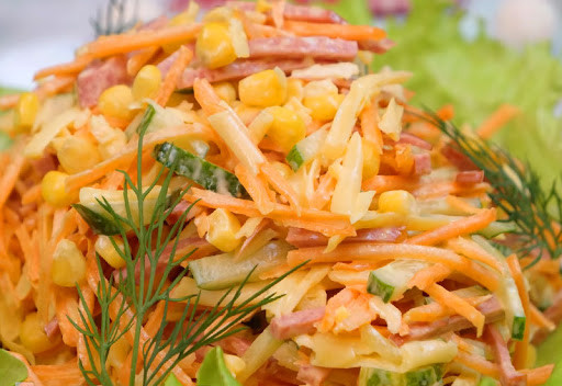 - Нарезам одинаково все продукты соломкой. Главное не солить, в этом и заключается изюминка. Сначала колбасу