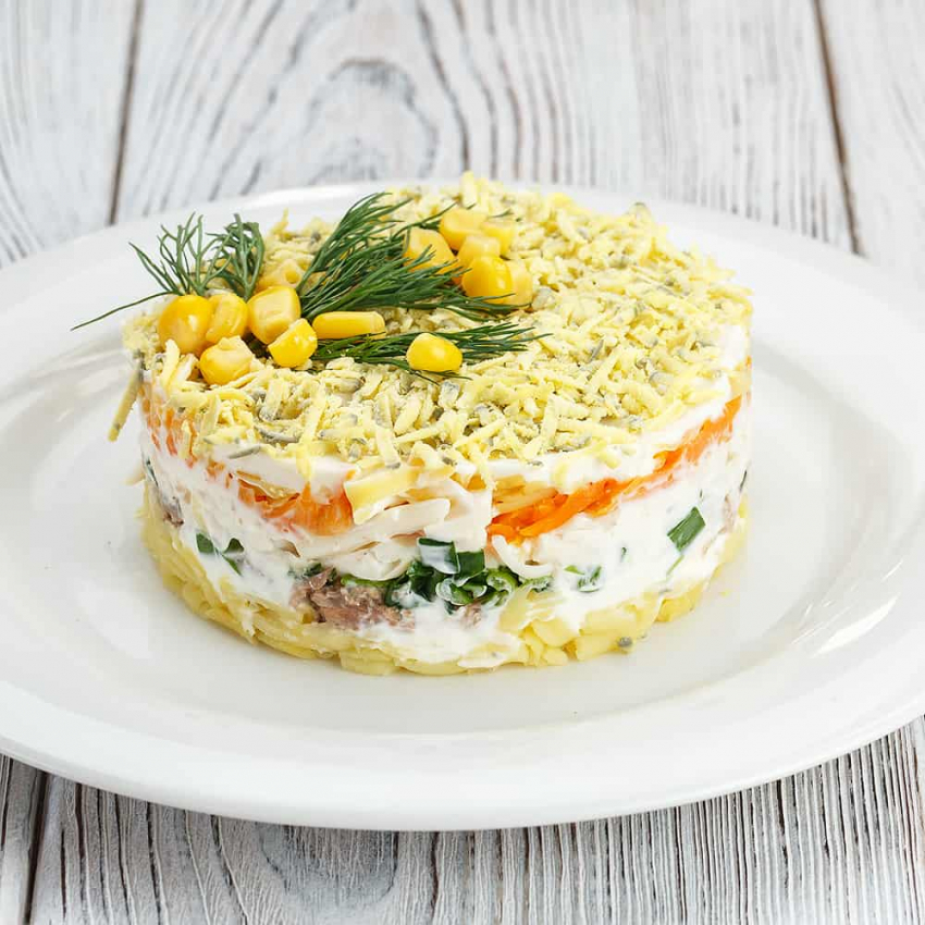 - Выкладываем слои, придерживаясь последовательности: (смазывая каждый небольшим количеством майонеза) картофель, рыба, лук, белки яиц, морковь, на верхушку салата выкладываем желтки.