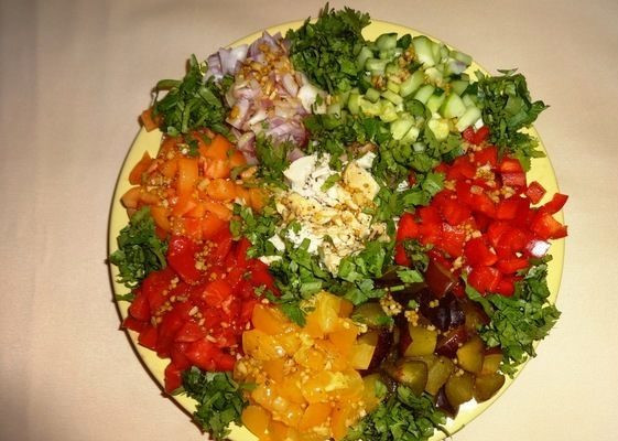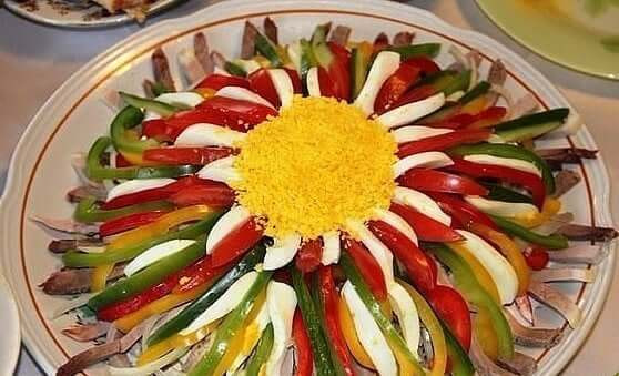 - Оформляем блюдо, выложив на середину посуды часть заправленного салата и сделав ложкой углубление. Сверху формируем лепестки слоями: сначала перец (красный, желтый), затем лук, потом свежий огурец, помидор, маринованный огурец и белки. В углубление крошим желток и украшаем зеленью.
