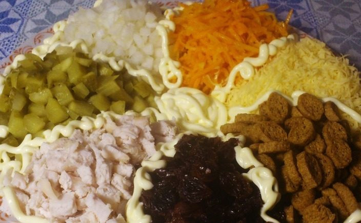 - По середине выложить сухарики. Перед подачей полить майонезом и перемешать с помощью вилки и ложки.