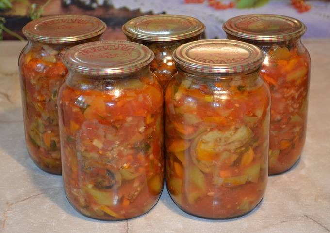 Этот рецепт также заслуживает внимания. Когда у вас много баклажанов, перцев и помидоров, лучше всего заготовить такой салат на зиму. Он непременно понравится всем в вашей семье.Приготовление