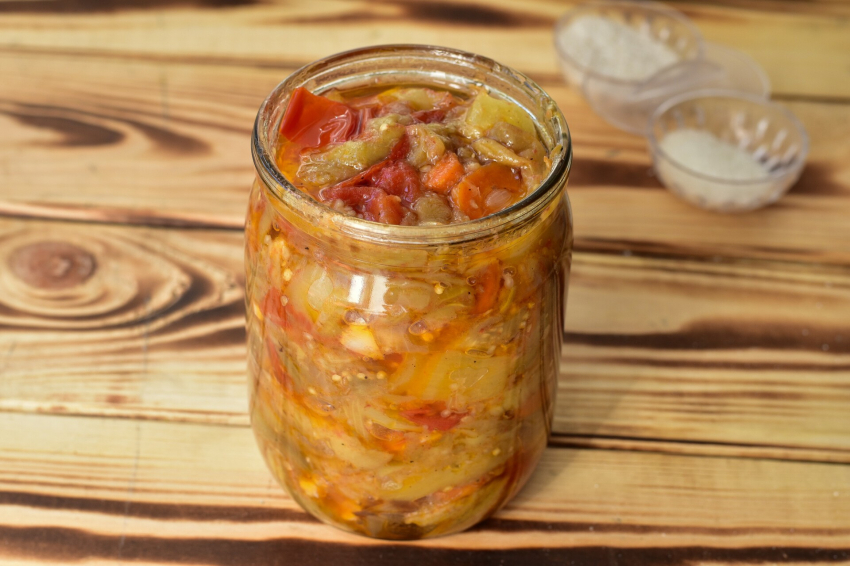 - Овощную массу перемешиваем, доводим до кипения, раскладываем в заранее простерилизованные банки. Банки с салатом ставим в кастрюлю с водой и стерилизуем в течение 20-25 минут. После чего сразу герметично укупориваем. Переворачиваем крышками вниз и закрываем теплым одеялом. Оставляем до полного остывания банок.
