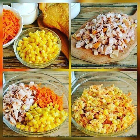 - Добавляем кукурузу, морковь и майонез. Все снова перемешиваем. Салат готов!