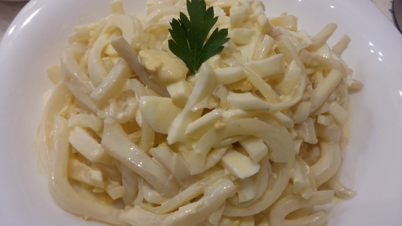 - Отварные кальмары режем полукольцами. Теперь все ингредиенты смешаем и заправим угощение соусом из сметаны и горчицы. Мы приготовили отличное блюдо!
